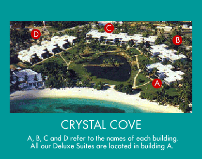 If you enjoy beautiful views with sea-grape trees on a white sand beach and spectacular colors across the waters to the outer islands, you'll love Crystal Cove. Crystal Cove is right on the best beach. Our accommodations are unusually spacious and comfortable one bedroom two bath Suites or large one bath Studios, both with huge living room areas. All include the convenience of a complete kitchen for breakfast or lunch even if you choose to dine out for dinner. Enjoy all the amenities of your own home such as a king size bed*, private bath, cable tv, vcr, complete kitchen, even a washer/dryer*. If you enjoy the comfort and privacy of your own vacation villa, without the hustle, noise, expense, and impersonal nature of a large hotel, you'll love Crystal Cove.